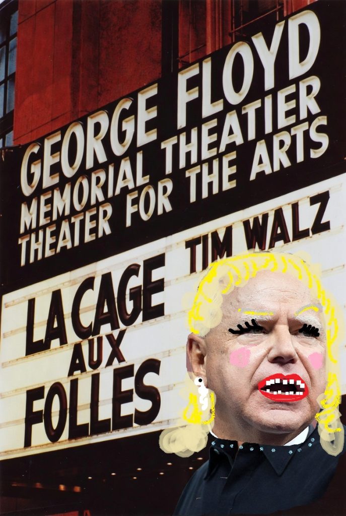 The marquee, already blazing in glittering lights above the newly christened George Floyd Memorial Theatier Theater for the Arts (built on an area which once housed a police precinct, a Target superstore, and a short-lived Tesla dealership), proudly proclaims: “LA CAGE AUX FOLLES – STARRING TIM WALZ AS ALBIN.”