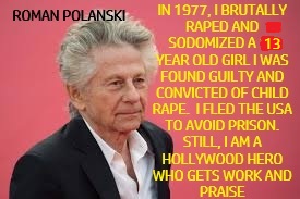 Roman Polanski raped a thirteen year old girl. In 1977 he took her to a house for a photo shoot. He gave her champagne. He gave her a Quaalude to drug her. Then he forced oral sex on her. He forced vaginal sex on her. He forced anal sex on her. She told him no over and over. She was scared and wanted to go home. He was forty three years old. She was just a child. This was not an allegation or rumor, this actually happened. If you think it can’t get worse than this — hold onto your hats.