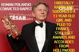 Polanski was charged with six felonious crimes, including rape by drugs and lewd acts on a child. He pleaded guilty to unlawful sexual intercourse with a minor. He served a little time then ran away to France in 1978. He became a fugitive from American justice and never came back to face full punishment. Throughout the years of hiding from American justice as a guilty child rapist, Hollywood has continued to endorse Polanski and to praise his work.
