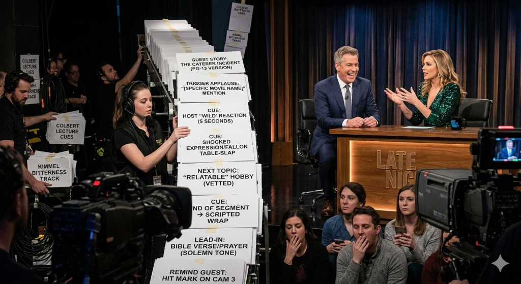 The late-night talk show, once a cathedral of spontaneous wit and late-hour sophistication, has devolved into a hollowed-out corporate product that relies entirely on the audience’s willingness to be conned. If you are sitting on your couch watching a “wild” moment, a host “losing it” with laughter, or a celebrity sharing a “shocking” secret, you need to understand that what you are actually witnessing is a meticulously choreographed piece of theater. It is a fake, a sham, and a betrayal of the viewer’s intelligence. To understand why modern late-night is utterly unwatchable, one has to look past the bright lights and see the machinery of deception underneath.