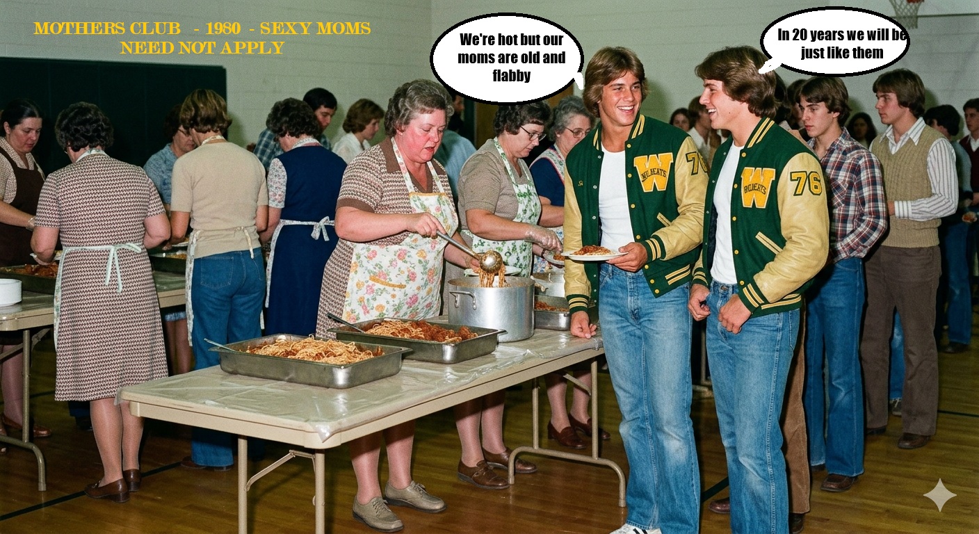 And then there were the sons—the “sexy jocks” who were the crown jewels of the Mothers Club. These kids were the golden boys of the 1960s, 1970s , 1980s, 1990s — protected by their mothers’ influence. They were too dim to realize that their mothers were the ones making the social rules that favored them. But the “merit” of a high school jock is a perishable commodity. By the time the 20th reunion rolls around, the golden boys are just “old guys” on Facebook, sporting the same “grandfatherly” bloat as their mothers, their high-school glory days entombed in a dusty trophy case.